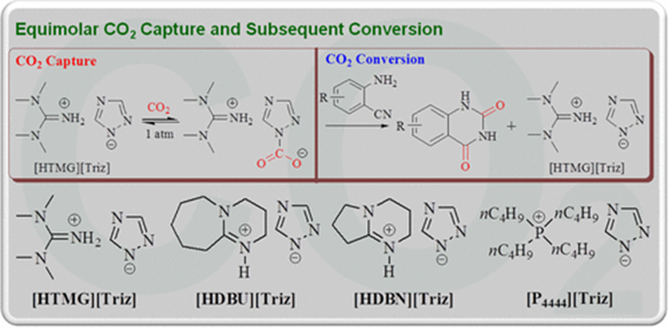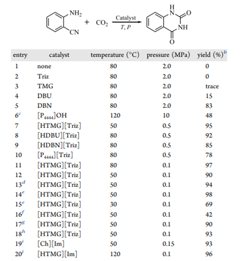 基于上述情景,青岛科技大学的刘猛帅等人将三唑离子液体作为催化剂,使用CO2与2-氨基苄腈合成了喹唑啉的衍生物。