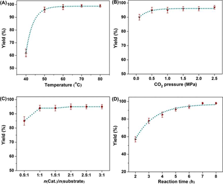 研究人员对不同的催化剂进行了测试,发现Triz和有机碱(例如TMG,DBU,DBN和[P4444]OH)单独使用时,催化活性较低,而具有不同阳离子的基于三唑鎓的离子液体在相同的条件下表现出更高的催化活性。对于[HTMG] [Triz],在50 °C时可提供95%的产物收率。[HTMG][Triz]与报道的[Ch][Im]和[HTMG][Im]催化剂相比,需要更短的反应时间和更低的反应温度。