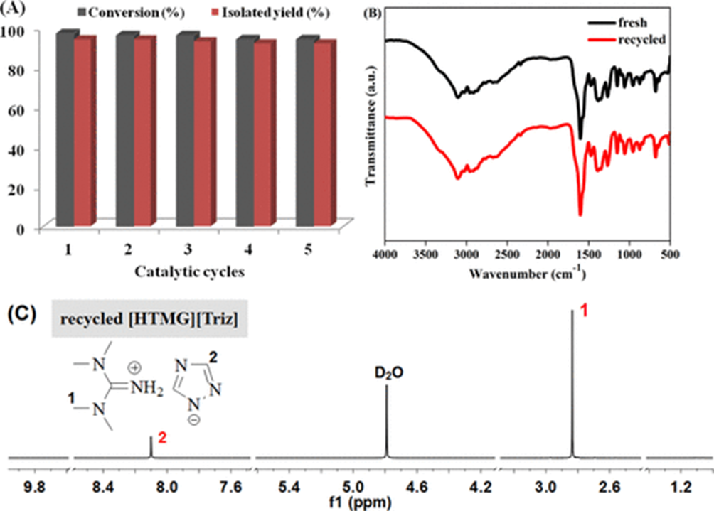 研究人员对[HTMG][Triz]循环性能进行测试发现,该催化剂使用五次活性也不会显着降低。[HTMG][Triz]的FTIR和1H NMR波谱测试发现观察到再循环的[HTMG][Triz]的特征峰与新鲜催化剂几乎相同,表明[HTMG][Triz]催化剂具有**的稳定性和可回收性。并且与其它催化剂相比,该催化剂具有反应条件较为温和,产率较高的优点。