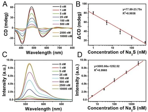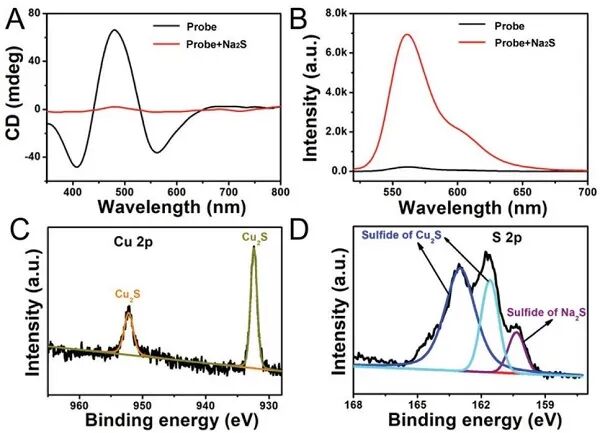 综上所述,作者设计了一种新的纳米结构,即CuxOS@ZIF-8纳米探针,可以对H2S进行超灵敏和选择性检测。利用CD和荧光光谱双信号,该探针不仅能在体外准确检测H2S,而且还能在活细胞和体内检测H2S。实验结果表明,当手性CuxOS被转化为非手性CuxOS时,有助于实现超敏检测。总之,该方法为生物催化、生物成像和生命科学诊断等领域的手性纳米结构研究开辟了新的途径。