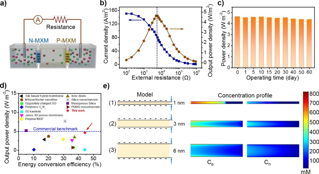 图三 带相反电荷的MXene膜组合对的反电渗析发电性能以及对应的Comsol仿真模拟。