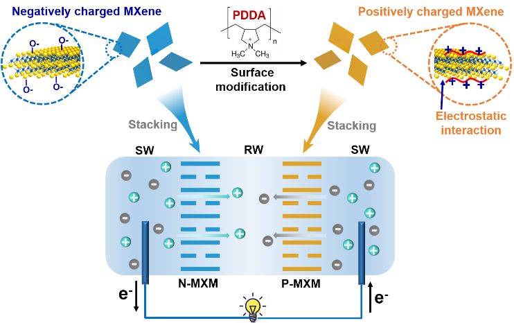 图一 带相反电荷的二维MXene膜对用于盐差能发电的示意图。SW, 海水;RW, 河水。