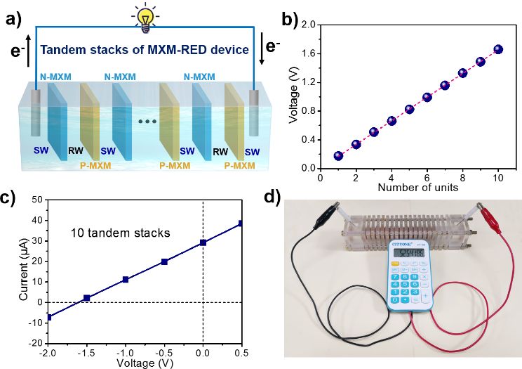 图四 串联的MXene膜组合对的发电性能。