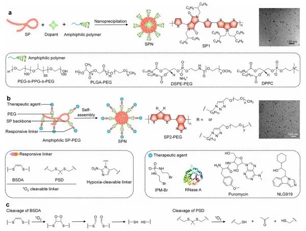 (b)通过自组装制备SPN的示意图,SP2-PEG,响应性片段和**剂的化学结构式以及SPN2的透射电子显微照片