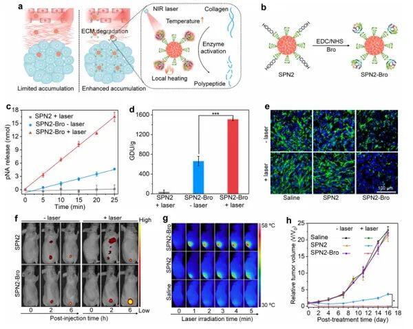 (a)SPN2-Bro的光热活化用于胶原蛋白降解和增强**组织中纳米颗粒富集的示意图