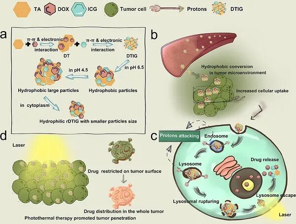 近日,中国药科大学姚静教授通过组装阿霉素、单宁酸和吲哚菁绿来制备纳米转换器(DTIG),以克服这一难题。亲水性DTIG可延长血液循环时间,此外还在酸性**微环境中转化为疏水性颗粒,被**细胞**内化。随后,在酸性溶酶体中进一步形成过大的疏水颗粒,通过破裂溶酶体逃逸。这些疏水性DTIGs能迅速回复到较小的亲水性纳米组装体,并在细胞质中释放**载荷。由于质子的作用,这些转化具有类似于蛋白质的变性和复性。此外,DTIG光热疗法可提高**在**中的渗透效率。这种优化的DTIG给药工艺提供了**的抗**疗效和明显的预后优势。该文章近日以题为“Transforming Complexity to Simplicity: Protein-Like Nanotransformer for Improving Tumor Drug Delivery Programmatically”发表在**期刊Nano Letters上。