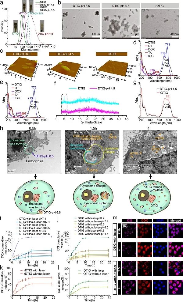 综上所述,作者构建了一种由DOX、TA和ICG组装的纳米转化器DTIG。由于可逆的亲水-疏水转换和重组-再组装过程,DTIG程序化地延长了血液循环时间、增加了细胞摄取、快速溶酶体逃逸和**的细胞内**载荷释放。机理研究表明,这些快速的、多性质的转变只有在质子浓度的作用下才会被激活。高质子浓度可引起DTIG的疏水重组。可逆地,DTIG在逃离高质子浓度环境后,能恢复亲水结构,**释放载荷。体外和体内药效学研究表明,DTIG+激光**具有良好的联合**效果和**渗透性。与以往需要较长时间进行化学反应的刺激反应性纳米**相比,DTIG显示出仅需几分钟的快速反应。DTIG的制备和组装条件简单,符合绿色化学原理。该研究为开发纳米**提供了一种新的策略,可以通过编程的方式突破不同的**靶向**传递障碍。