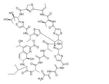 Thiostrepton is a natural cyclic oligopeptide antibiotic, derived from several strains of strepromycetes.