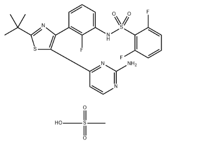 Dabrafenib Mesylate is the mesylate salt form of dabrafenib, an orally bioavailable inhibitor of B-raf (BRAF) protein with IC50s of 0.8 nM, 3.2 nM and 5 nM for B-Raf (V600E), B-Raf (WT) and C-Raf, respectively.