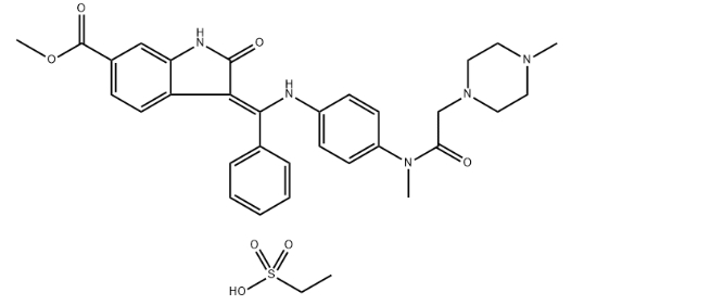 Nintedanib is a small molecule tyrosine-kinase inhibitor with IC50 of 34 nM/13 nM/13 nM, 69 nM/37 nM/108 nM and 59 nM/65 nM for VEGFR1/2/3, FGFR1/2/3 and PDGFRα/β, respectively.