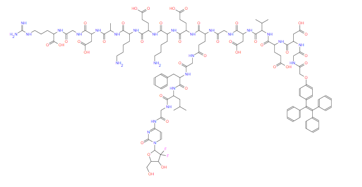 SMILES:CC(C)CC(NC(=O)C(CC1=CC=CC=C1)NC(=O)CNC(=O)CCC(NC(=O)CNC(=O)C(CC(=O)O)NC(=O)C(NC(=O)C(CCC(=O)O)NC(=O)C(CC(=O)O)NC(=O)CNC(=O)COC1=CC=C(C(=C(C2=CC=CC=C2)C2=CC=CC=C2)C2=CC=CC=C2)C=C1)C(C)C)C(=O)NC(CCC(=O)O)C(=O)NC(CCCCN)C(=O)NC(CCC(=O)O)C(=O)NC(CCCCN)C(=O)NC(C)C(=O)NC(CC(=O)O)C(=O)NCC(=O)NC(CCCNC(=N)N)C(=O)O)C(=O)NCC(=O)NC1=NC(=O)N(C2OC(CO)C(O)C2(F)F)C=C1