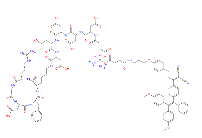 SMILES:COC1=CC=C(C(=C(C2=CC=CC=C2)C2=CC=C(C(/C=C/C3=CC=C(OCCCNC(=O)CCC(=O)O[Pt]([NH3+])([NH3+])(Cl)(Cl)OC(=O)CCC(=O)NC(CC(=O)O)C(=O)NC(CC(=O)O)C(=O)NC(CC(=O)O)C(=O)NC(CC(=O)O)C(=O)NC(CC(=O)O)C(=O)NCCCCC4NC(=O)C(CC5=CC=CC=C5)NC(=O)C(CC(=O)O)NC(=O)CNC(=O)C(CCCNC(=N)N)NC4=O)C=C3)=C(C#N)C#N)C=C2)C2=CC=C(OC)C=C2)C=C1