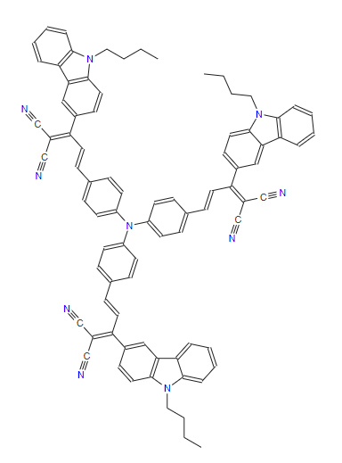 SMILES:CCCCN1C2=C(C=CC=C2)C2=C1C=CC(C(/C=C/C1=CC=C(N(C3=CC=C(/C=C/C(=C(C#N)C#N)C4=CC5=C(C=C4)N(CCCC)C4=CC=CC=C54)C=C3)C3=CC=C(/C=C/C(=C(C#N)C#N)C4=CC=C5C(=C4)C4=C(C=CC=C4)N5CCCC)C=C3)C=C1)=C(C#N)C#N)=C2