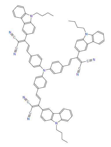 SMILES:CCCCN1C2=C(C=CC=C2)C2=C1C=CC(C(/C=C/C1=CC=C(N(C3=CC=C(/C=C/C(=C(C#N)C#N)C4=CC5=C(C=C4)N(CCCC)C4=CC=CC=C54)C=C3)C3=CC=C(/C=C/C(=C(C#N)C#N)C4=CC=C5C(=C4)C4=C(C=CC=C4)N5CCCC)C=C3)C=C1)=C(C#N)C#N)=C2