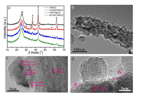 (c,d)分别为FeP/TiN/CC和Ni-FeP/TiN/CC的HR-TEM图像。