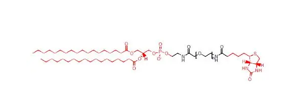 DSPE PEG生物素是Nanocs的功能性磷脂PEG衍生物之一,其具有生物素和通过线性PEG接头桥接的DSPE磷脂。DSPE(1,2-二硬脂酰-sn-甘油-3-磷酸乙醇胺)是一种高度疏水的18碳磷脂。另一方面,PEG骨架具有良好的亲水性和水溶性。生物素是一种常用的生物活性分子,对亲和素或链霉亲和素具有高结合亲和力。生物素/链霉亲和素系统已被广泛用于蛋白质、核酸和许多其他生物分子的检测和纯化。生物素修饰的DSPE-PEG可并入脂质体和其他纳米颗粒中,因此可用于靶向和检测抗生物素或链霉亲和素缀合的底物。