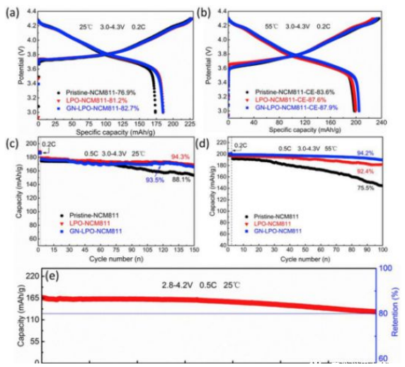 多功能涂层包覆的NCM811材料无论在低温(25℃)还是高温(55℃)条件下,容量保持率都远远高于未改性NCM811材料。GN-LPO-NCM811/石墨纽扣型全电池同样具有的**循环稳定性。