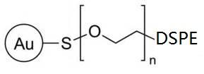 Spherical Gold Nanoparticle-polyethylene glycol-DSPE,金纳米粒子粒径在5-100nm间可选,PEG分子量可选550、1000、2000、5000,通过PEG短链连接活性基团和金纳米粒子,PEG化Au纳米粒子可以增加纳米颗粒的生物相容性,增加其在体内循环时间,表面功能化官能团可以结合DNA,抗体,多肽,蛋白质,小分子等实现对不同靶标物质的特异性检测。