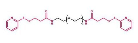 邻吡啶二硫醚(OPSS)功能化的聚乙二醇(OPSS PEG)是硫醇(-SH)基反应性PEG衍生物,可用于通过其可用的硫醇基团修饰生物分子或其他材料。 邻吡啶基二硫键与巯基反应形成稳定的二硫键,同时释放巯基吡啶基。