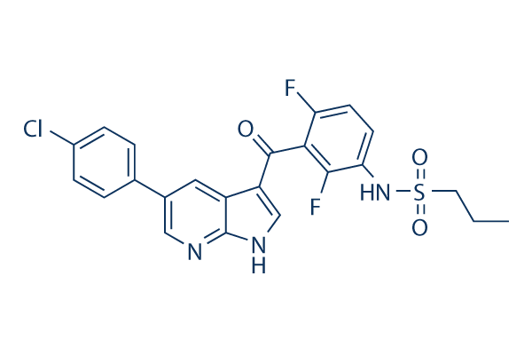 分子式:C23H18ClF2N3O3S, 分子量:489.92, 纯度: > 98%, 溶解性: (R.T.: 25℃): DMSO, Vemurafenib (PLX4032, RG7204)是一种新型B-RafV600E,IC50为31 nM。Vemurafenib对B-RafV600E的选择性比对野生型B-Raf的选择性高10倍,在细胞实验中,选择性可高100倍以上。