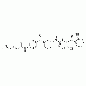 分子式:C31H28ClN7O2,分子量:566.05,纯度: > 98%,溶解性: (R.T.: 25℃): DMSO,THZ2 是选择性的CDK7 ,IC50 值为 13.9 nM。