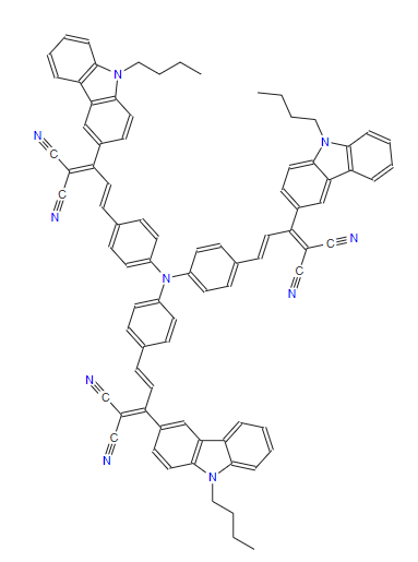 SMILES:CCCCN1C2=C(C=CC=C2)C2=C1C=CC(C(/C=C/C1=CC=C(N(C3=CC=C(/C=C/C(=C(C#N)C#N)C4=CC5=C(C=C4)N(CCCC)C4=CC=CC=C54)C=C3)C3=CC=C(/C=C/C(=C(C#N)C#N)C4=CC=C5C(=C4)C4=C(C=CC=C4)N5CCCC)C=C3)C=C1)=C(C#N)C#N)=C2