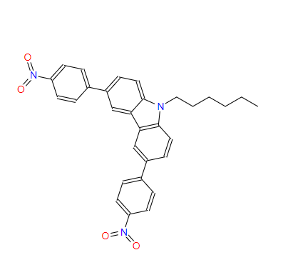 SMILES:CCCCCCN1C2=CC=C(C3=CC=C([N+](=O)[O-])C=C3)C=C2C2=C1C=CC(C1=CC=C([N+](=O)[O-])C=C1)=C2